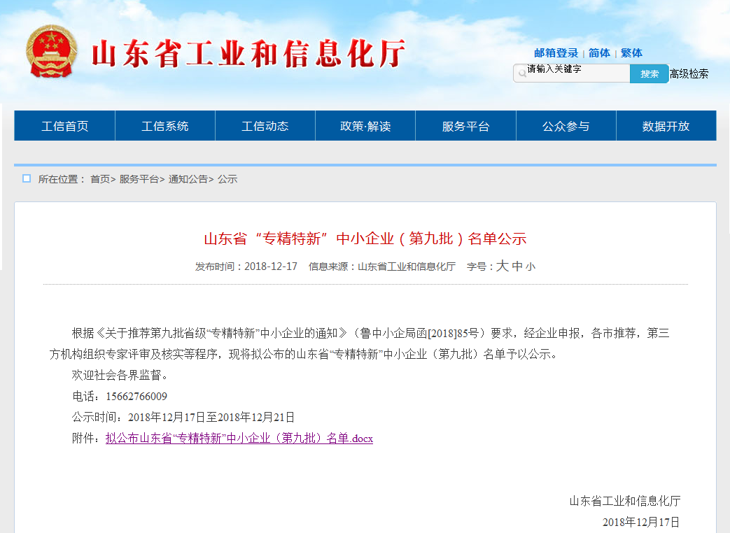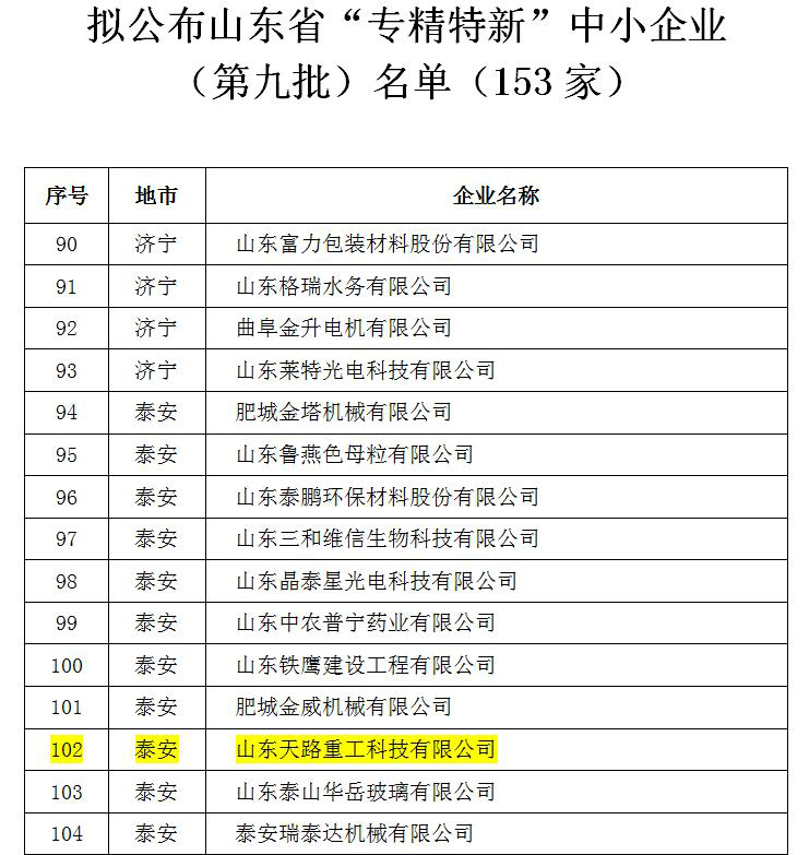 2018年12月21日,在公示期結(jié)束之后,天路重工再次拿下了一項(xiàng)企業(yè)界大獎(jiǎng)--山東省“專(zhuān)精特新”中小企業(yè)榮譽(yù)稱(chēng)號(hào)!
